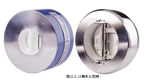 蝶形止回閥或雙盤(pán)式止回閥克服了擺動(dòng)式及碟片式止回閥的口徑和壓降限制,懸啟式止回閥的閥瓣被 一分為二,在中間鉸接。這樣兩個(gè)碟片只能在一個(gè)方向擺動(dòng),碟片靠裝在鉸鏈上的紐彈簧壓在閥座上。 為了能在流道中心有一個(gè)鉸鏈,需在外面安裝一個(gè)固定銷(xiāo),這樣就會(huì)引起閥門(mén)的泄漏,設(shè)計(jì)改進(jìn)后 可在里面安裝,流體就可以密封在閥體內(nèi)部,不會(huì)泄漏到外面(見(jiàn)圖12.3.13)。