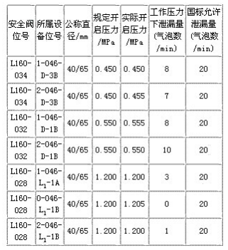 針對受熱變形泄漏問題,經(jīng)反復(fù)比較試驗(yàn),改進(jìn)了原安全閥密封結(jié)構(gòu),將閥瓣與導(dǎo)向塊連成一體,將錐面密封改為平面密封,增加了閥瓣厚度,并在閥座和閥瓣的密封面上堆焊鈷基硬質(zhì)合金,以提高密封面的耐溫性能和表面硬度,解決了受熱變形泄漏問題,改進(jìn)后的閥瓣結(jié)構(gòu)見圖1b。根據(jù)成套設(shè)備的安裝尺寸及性能參數(shù),首批試制了2個(gè)品種、3個(gè)規(guī)格共7臺平面密封安全閥,適用介質(zhì)為聯(lián)苯加聯(lián)苯醚,工作溫度小于或等于330 ℃,開啟壓力分別為0.45MPa、0.55MPa和1.2MPa。安裝于某生產(chǎn)線上連續(xù)試用123天,停產(chǎn)檢修時(shí)拆下進(jìn)行開啟壓力和密封性檢驗(yàn),結(jié)果見表1。表中數(shù)據(jù)說明,試用的這批安全閥,開啟壓力和密封性能均達(dá)到國家標(biāo)準(zhǔn)規(guī)定的優(yōu)質(zhì)品要求。