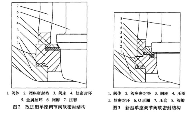 隨著工業(yè)技術(shù)的發(fā)展 ,用戶希望獲得更高質(zhì)量的閥門 ,同時(shí)也要求提高閥門的使用、維修水平。這就對(duì)工程技術(shù)人員提出了新的要求 ,除了要精心設(shè)計(jì)出高質(zhì)量和高水平的閥門 ,合理選用和正確操作之外 ,還要方便維修人員的維修和拆卸 ,方便快捷 , 使各類事故及維修時(shí)間降到最低限度。于是 ,對(duì)于單座調(diào)節(jié)閥來(lái)說(shuō) ,就出現(xiàn)了圖 2所示的改進(jìn)型軟密封結(jié)構(gòu)設(shè)計(jì)。在這種結(jié)構(gòu)設(shè)計(jì)中 ,用金屬擋環(huán)和軟密封環(huán)代替了傳統(tǒng)結(jié)構(gòu)中用螺釘固定嵌入式軟密封環(huán)的設(shè)計(jì) ,用壓套和閥座密封墊直壓式結(jié)構(gòu)設(shè)計(jì)代替了傳統(tǒng)結(jié)構(gòu)中閥座采用螺紋連接的設(shè)計(jì)。這樣的設(shè)計(jì)優(yōu)點(diǎn)是當(dāng)閥瓣和閥座達(dá)到最后關(guān)閉位置時(shí) ,閥瓣給閥座的部分力由金屬擋環(huán)承擔(dān) ,并直接傳到閥座,這樣就排除了軟密封環(huán)因過載而損壞 ,而且金屬擋環(huán)還提供了一定的輔助密封作用。直壓式結(jié)構(gòu)設(shè)計(jì)也改變了需要專用工裝才能拆卸的螺紋連接閥座設(shè)計(jì) ,裝配與拆卸、現(xiàn)場(chǎng)維修與更換都十分方便。