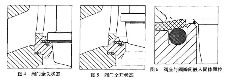 對(duì)于夾帶固體顆粒的流體介質(zhì) ,軟閥座閥門的密封結(jié)構(gòu)更為重要。這主要是因?yàn)榻橘|(zhì)中夾帶有固體顆粒時(shí) ,極容易卡在閥瓣和閥座的密封面之間 ,妨礙了閥座的密封 ,會(huì)引起泄漏 ,繼而由于介質(zhì)的高速?zèng)_刷而使閥座表面被沖蝕破壞。對(duì)于上述具有二級(jí)關(guān)閉作用的軟閥座密封結(jié)構(gòu) (圖 6) ,即使出現(xiàn)了這種顆粒卡在閥瓣和閥座金屬密封部位之間 ,也不會(huì)有什么危害 ,因?yàn)檫€有閥瓣和軟閥座之間的密封 ,仍能起到可靠有效的補(bǔ)充密封作用。