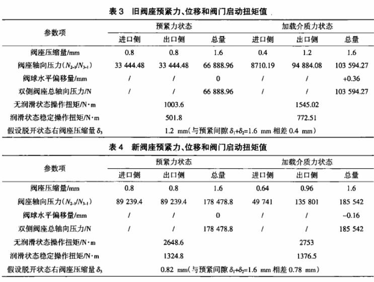 根據(jù)有限元分析結合N-ö曲線數(shù)據(jù)分別計算舊閥座和新閥座的啟動扭矩結果見表3和表4,從中可以看出,無論新舊閥座,在無潤滑狀態(tài)下的操作扭矩均遠大于有潤滑狀態(tài)下的操作扭矩值。同時由于新舊閥座內曲面半徑R的變化,直接導致了閥門的操作扭矩發(fā)生了明顯的不同,新閥座明顯大于舊閥座。