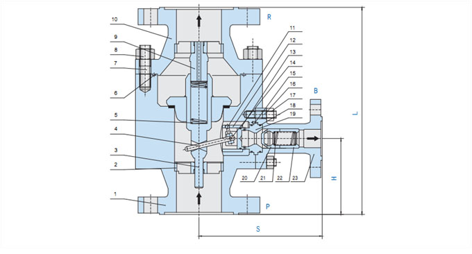 根據(jù)感應(yīng)到的主路流量不同,自動(dòng)再循環(huán)閥的主閥瓣止回錐將自動(dòng)移動(dòng)到某一個(gè)位置上。同時(shí)主閥瓣帶動(dòng)旁路閥杠桿,將主閥瓣動(dòng)作傳遞至旁路,通過杠桿控制旁路閥閥瓣的位置,改變旁路的節(jié)流面積,從而控制通過旁路的流量。當(dāng)主閥瓣回至閥座關(guān)閉狀態(tài)時(shí),所有流量通過旁路回流。當(dāng)主閥瓣上升至頂端位置時(shí),旁路則完全關(guān)閉,所有泵的流量流向工藝系統(tǒng)。該閥集四種功能于一體。